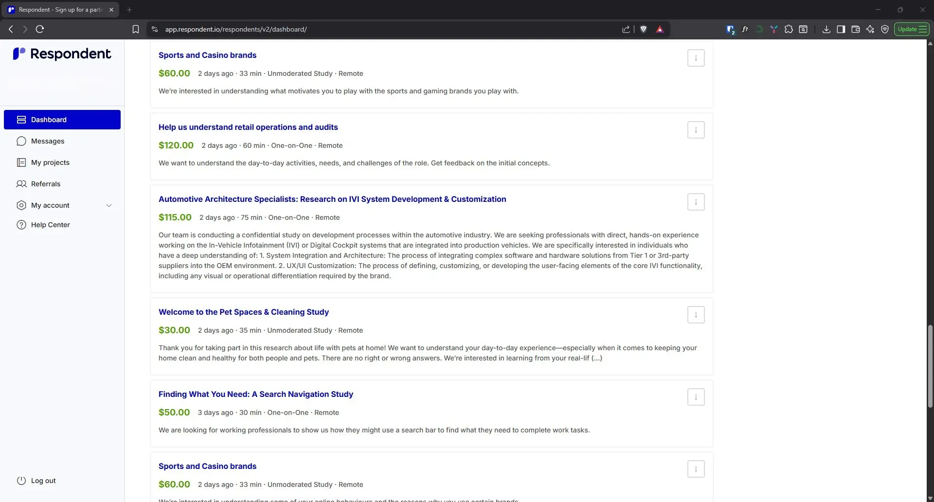 Respondent is one of the largest platforms, and has many different types of studies. Sometimes there is a heavy IT focus, but lots of finance related opportunities too.