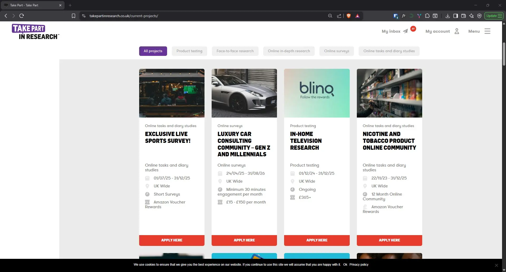 Take Part in Research aggregates opportunities from UK research institutions and agencies. You'll find academic studies, government research, and commercial projects all in one place. The variety is excellent—from quick online surveys to multi-week diary studies. Payment varies significantly by study type, but the platform's strength is the sheer range of opportunities available.